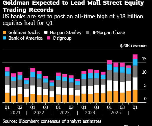 华尔街大型银行瞻望将公布创记载的一季度股票来去收入,或达180亿好意思元,好意思国与伊朗的构兵、以及阛阓对东谈主工智能可能颠覆经济诸多范围的惊惧挥之不去,均促使投资者来去行为加多。